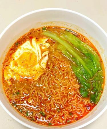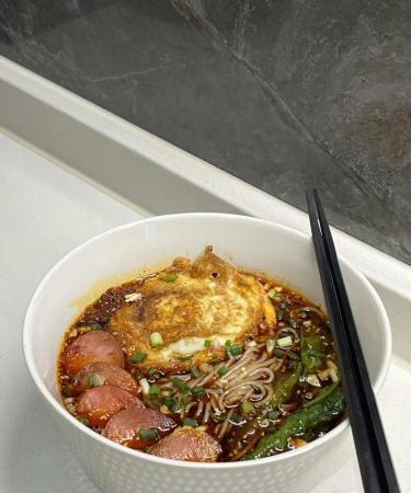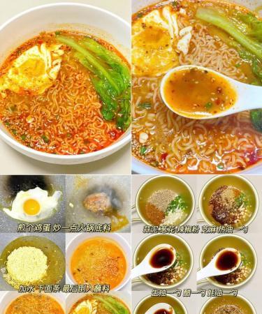 2⃣️油熱放一點火鍋底料炒出紅油,加清水煮開放入泡麵,煮熟連湯倒入碗裡,澆上醬汁,放個荷包蛋和生菜就完成啦~