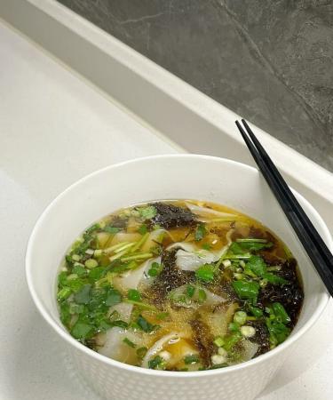 3️⃣碗中放蔥末、香菜、紫菜、豬油、榨菜、再放鹽➕味精➕生抽 陳醋➕白胡椒粉➕花椒麵➕少許香油和藤椒油、倒入半碗麵片湯