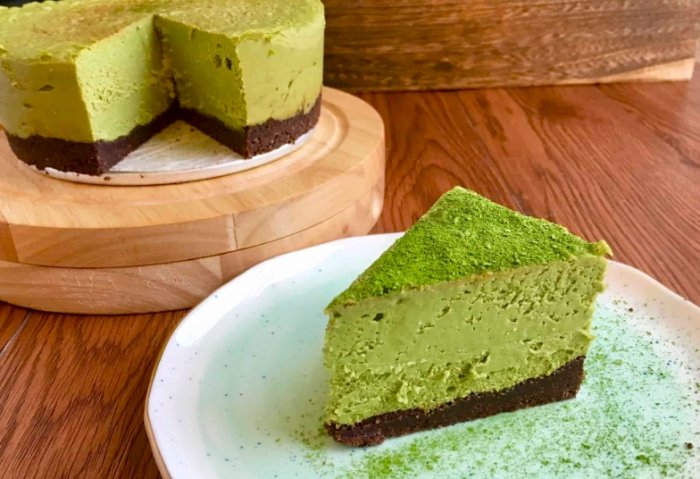 - 組合: 把冷凍庫的模具拿出來,將完成的抹茶起司餡倒在餅底上。用刮刀將表面 抹平。