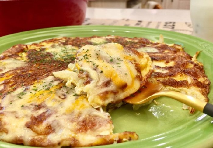6. 享用時刻: 拿出來稍微放涼幾分鐘再切,比較不會散開。直接吃就很美味,喜歡的話可以淋一點點淡醬油或Tabasco辣椒醬提味。
